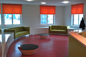 Einstellen farbiger dynamischer Raumelemente zur Brechung der orthogonalen Monotonie der Räume bei gleichzeitiger klarer räumlicher Bewegungsleitung