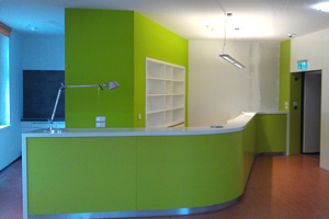 Einrichtung Studienambulanz Helmholtz-Kohorte – Geschoßumbau ehemaliges Universitätsklinikum der Martin-Luther-Universität Halle zu Empfangsbereich mit Untersuchungsräumen