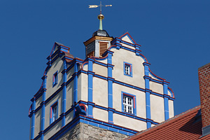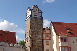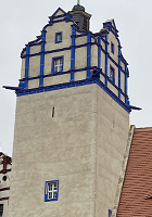 Anschließend konnten in einem 2. BA die Sanierung und Teilrekonstruktion des gesamten Dachtragwerkes inkl. Dachreiter und der inneren Holzkonstruktion des Turmes in statisch-konstruktiver und zimmermannsmäßiger Manier einhergehend mit der Wiederherstellung der Dacheindeckung sowie die komplette Mauerwerks- und Kunststeinsanierung und der Verputz der vier Schweifgiebel erfolgen. Sichtbares Zeichen der Wiederherstellung des Turmkopfes ist die anhand von Befunden rekonstruierte Farbfassung des Turmkopfes.