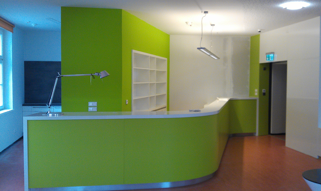 Einrichtung Studienambulanz Helmholtz-Kohorte – Geschoßumbau ehemaliges Universitätsklinikum der Martin-Luther-Universität Halle zu Empfangsbereich mit Untersuchungsräumen