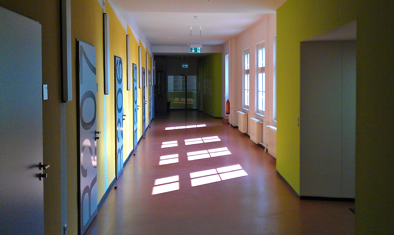 Einstellen farbiger dynamischer Raumelemente zur Brechung der orthogonalen Monotonie der Räume bei gleichzeitiger klarer räumlicher Bewegungsleitung