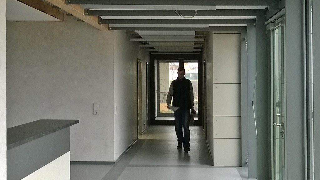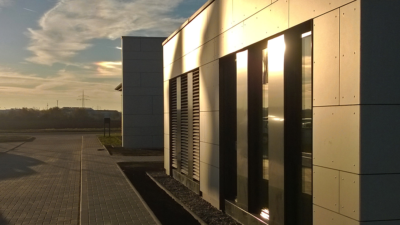 Die vorhandene gewerbliche Nutzfläche war an Ihre Kapazitätsgrenze gelangt und musste deshalb räumlich verändert werden. Der Altbau, der dabei weiter in Nutzung blieb, wurde durch einen 1-stöckigen Erweiterungsbau in Holzrahmenbauweise mit neuem repräsentativem Eingang, neuen Büroflächen und Werkstattplätzen sowie Lagerräumen ergänzt. Der Ergänzungsbau schließt sich dem Altbau direkt über einen Glas- Verbindergang an und erweitert sich in Nord-West Richtung. Die bestehende Einfahrtsstraße wird fortgeführt und eine Zufahrt zu einer separaten technischen Anlieferung/ Versorgung geschaffen. Der alte Eingang an der Rudolf-Walther-Straße 4 verbleibt für den Publikumsverkehr und ist hauptsächlich der Präsentation und der Kundenbetreuung vorbehalten. Der neue Eingangsbereich an der Südseite ist internen Funktionen zugedacht, um eine Trennung von externen und internen Arbeitsaufgaben gewährleisten zu können. Die neuen Räumlichkeiten gliedern sich modular an einen zentralen Flurbereich an. Der Charakter des Holzständerbaus ist von weitgehender Ablesbarkeit der verwendeten Baumaterialien und Installationen geprägt.