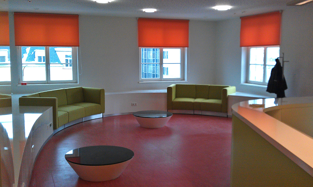 Einstellen farbiger dynamischer Raumelemente zur Brechung der orthogonalen Monotonie der Räume bei gleichzeitiger klarer räumlicher Bewegungsleitung