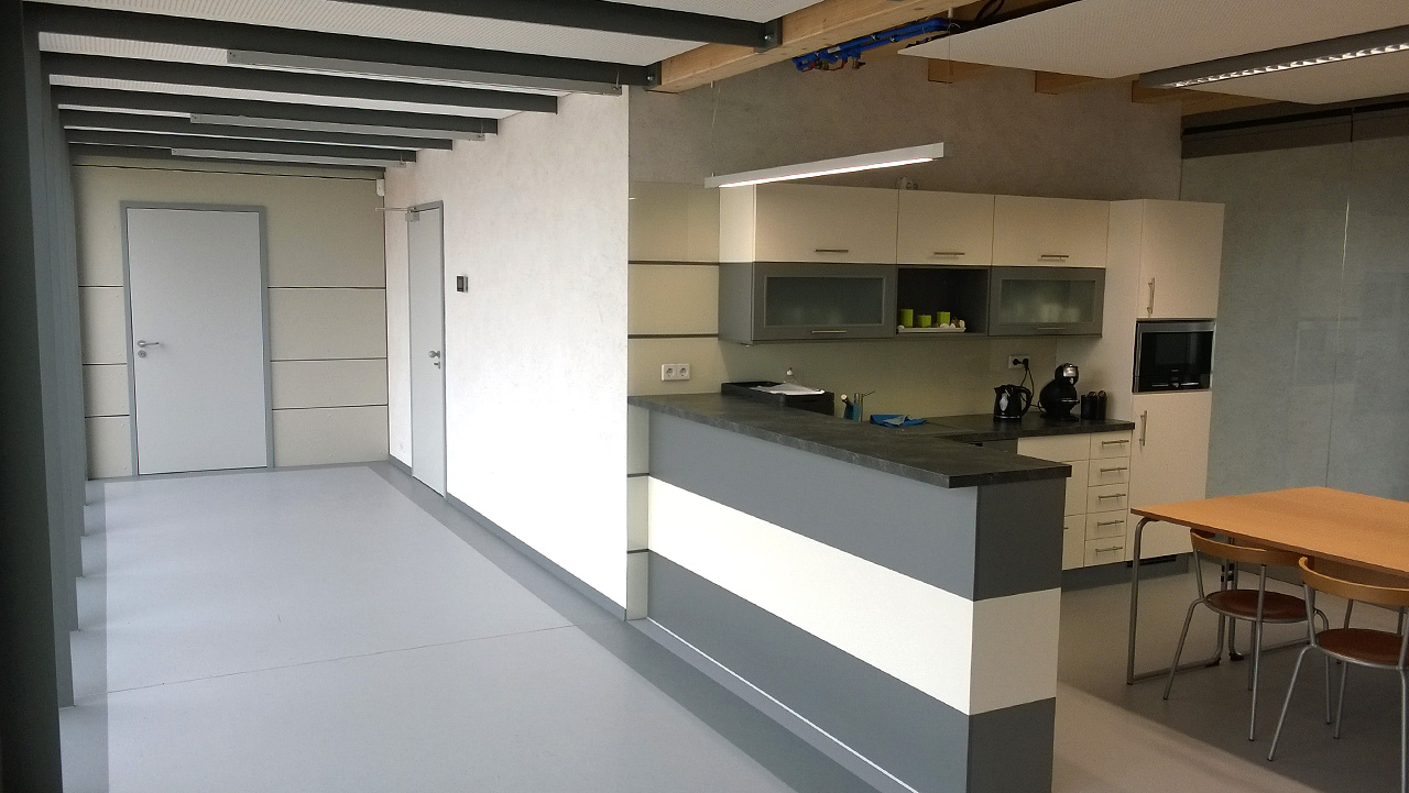 Die vorhandene gewerbliche Nutzfläche war an Ihre Kapazitätsgrenze gelangt und musste deshalb räumlich verändert werden. Der Altbau, der dabei weiter in Nutzung blieb, wurde durch einen 1-stöckigen Erweiterungsbau in Holzrahmenbauweise mit neuem repräsentativem Eingang, neuen Büroflächen und Werkstattplätzen sowie Lagerräumen ergänzt. Der Ergänzungsbau schließt sich dem Altbau direkt über einen Glas- Verbindergang an und erweitert sich in Nord-West Richtung. Die bestehende Einfahrtsstraße wird fortgeführt und eine Zufahrt zu einer separaten technischen Anlieferung/ Versorgung geschaffen. Der alte Eingang an der Rudolf-Walther-Straße 4 verbleibt für den Publikumsverkehr und ist hauptsächlich der Präsentation und der Kundenbetreuung vorbehalten. Der neue Eingangsbereich an der Südseite ist internen Funktionen zugedacht, um eine Trennung von externen und internen Arbeitsaufgaben gewährleisten zu können. Die neuen Räumlichkeiten gliedern sich modular an einen zentralen Flurbereich an. Der Charakter des Holzständerbaus ist von weitgehender Ablesbarkeit der verwendeten Baumaterialien und Installationen geprägt.